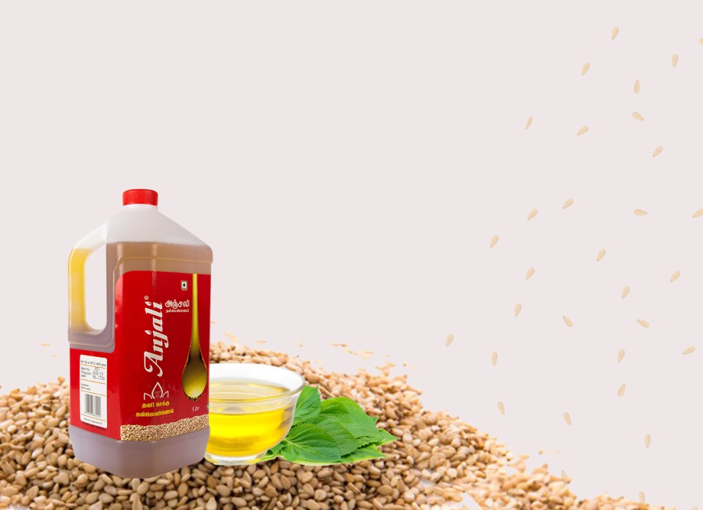 Best gingelly oil manufacturing company in Madurai. We procure high-quality raw seeds from the best Indian fields to extract the oil using cold-pressed method. We adhere to high-quality production standards which ensure consistent taste in all seasons of foods cooked with sesame oil. Buy Anjali cold-pressed sesame oil online and experience its health benefits including skin care, oral health, hair and scalp nourishment.